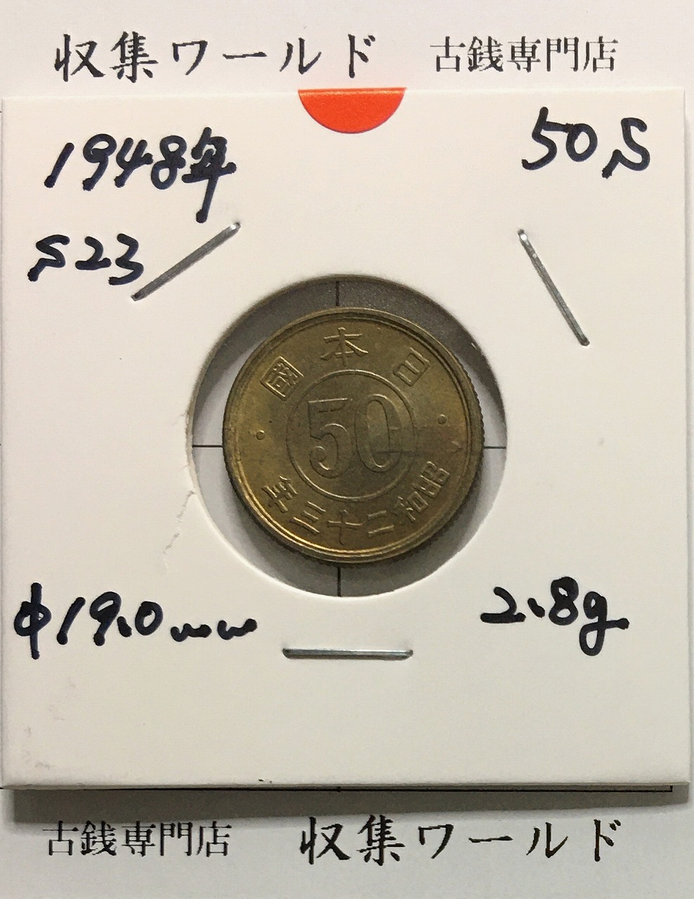 50銭黄銅貨 昭和23年(1948) 小型50銭黄銅貨 近01-19/並年 未使用-1014に関しての問合せは、下記より気軽にご連絡下さい。