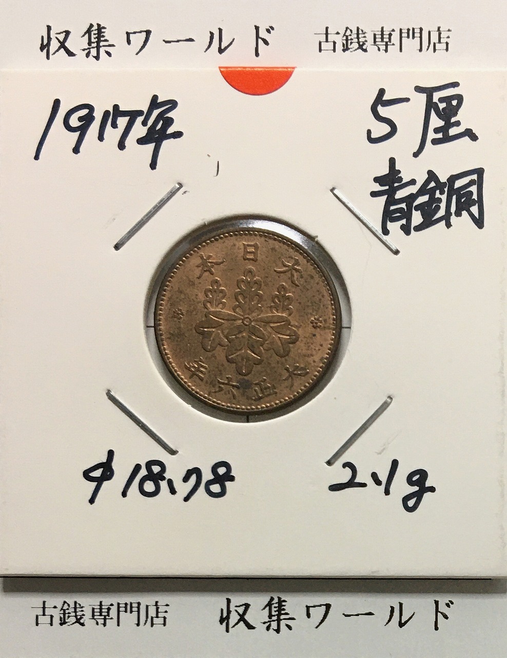 5厘青銅貨 大正6年(1917) 五厘青銅貨 近01-54/特年 極美品-1020
