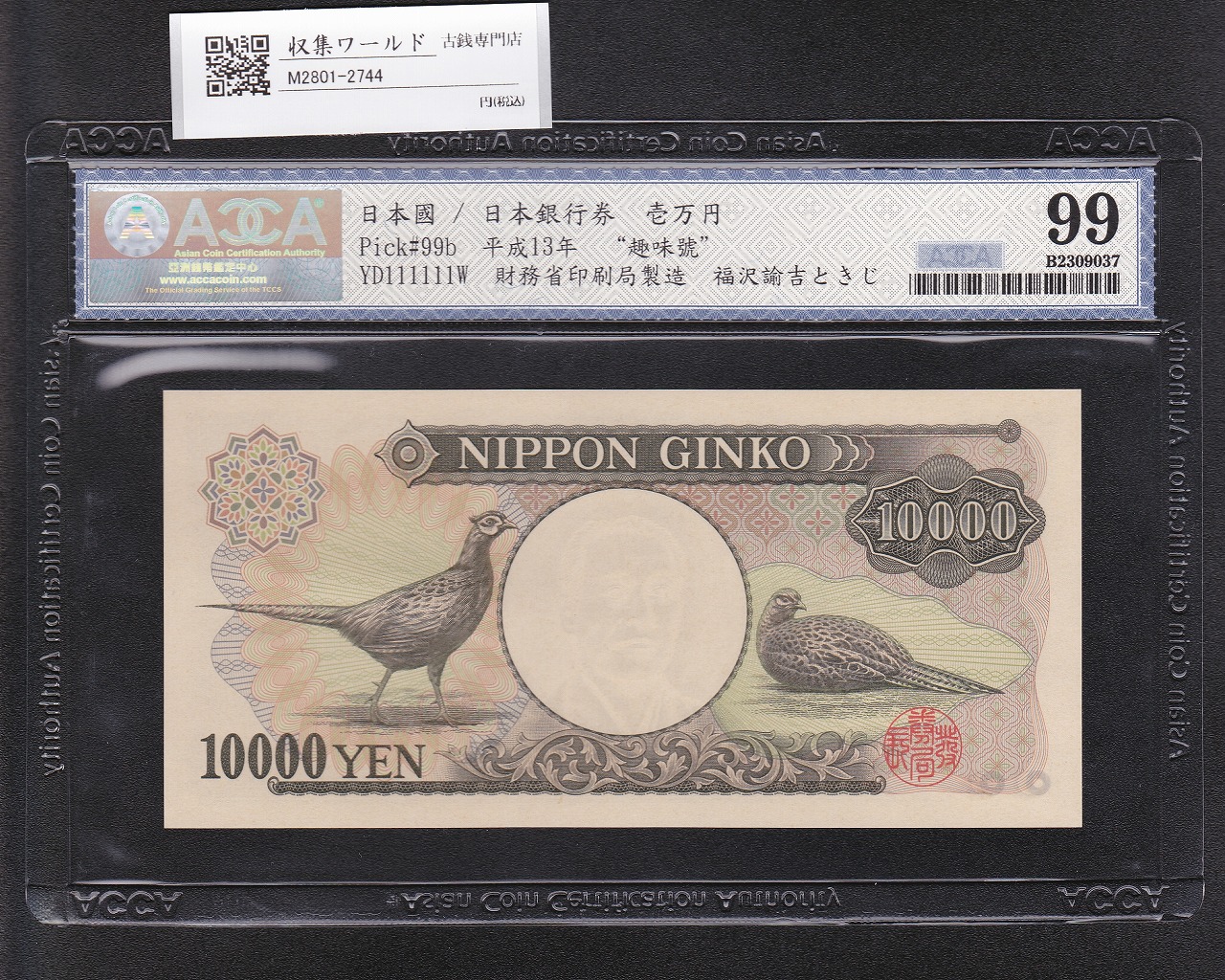 旧福沢 10000円札 2001年(H13) 財務省銘/褐色2桁ゾロ目 YD111111W 完未品に関しての問合せは、下記より気軽にご連絡下さい。