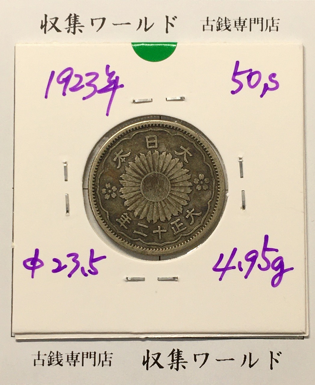 鳳凰 50銭銀貨 大正12年 (1923年) 小型五十銭銀貨/量目 4.95g/美品に関しての問合せは、下記より気軽にご連絡下さい。