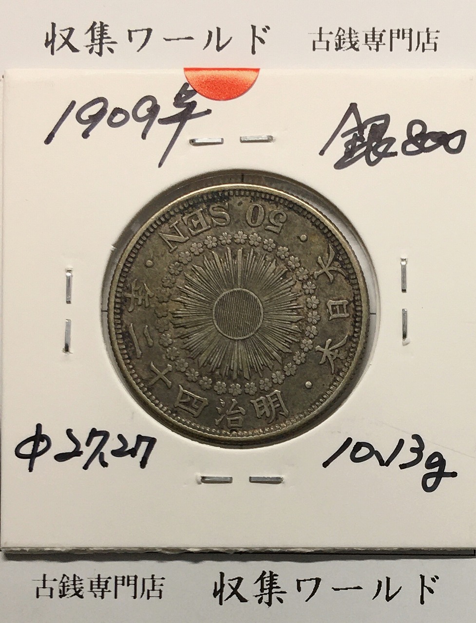 旭日 50銭銀貨 1909年(明治42年) 50sen銀貨 近代貨幣/極美品