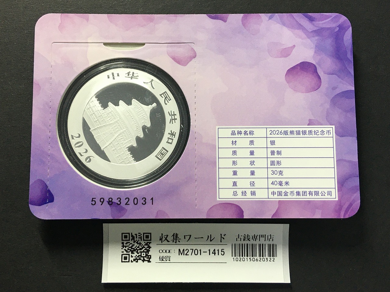中国人民銀行 10元パンダ銀貨 2026年銘 30g純銀 カード型-1415の詳細情報は、