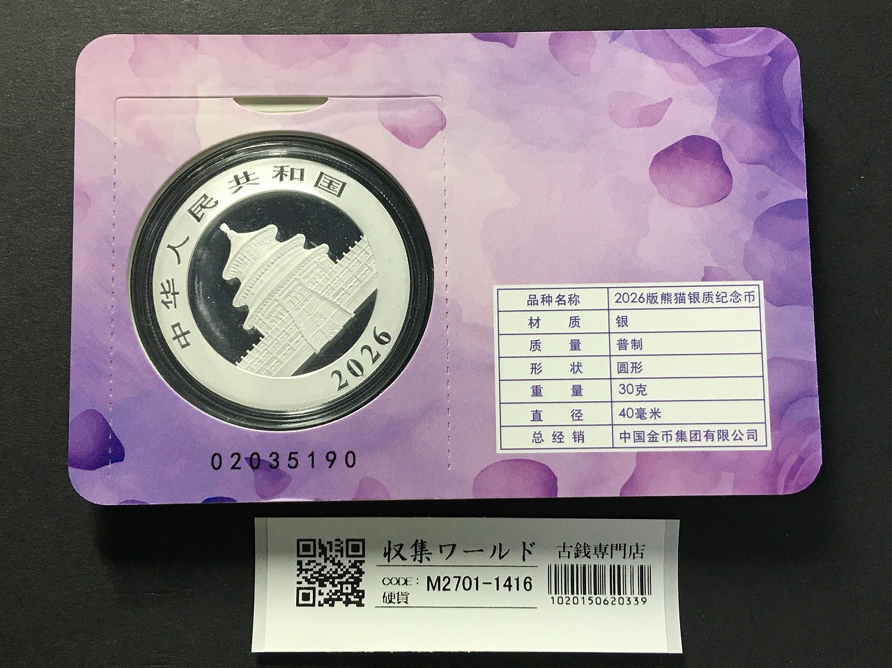 中国人民銀行 10元パンダ銀貨 2026年銘 30g純銀 カード型-1416の詳細情報は、